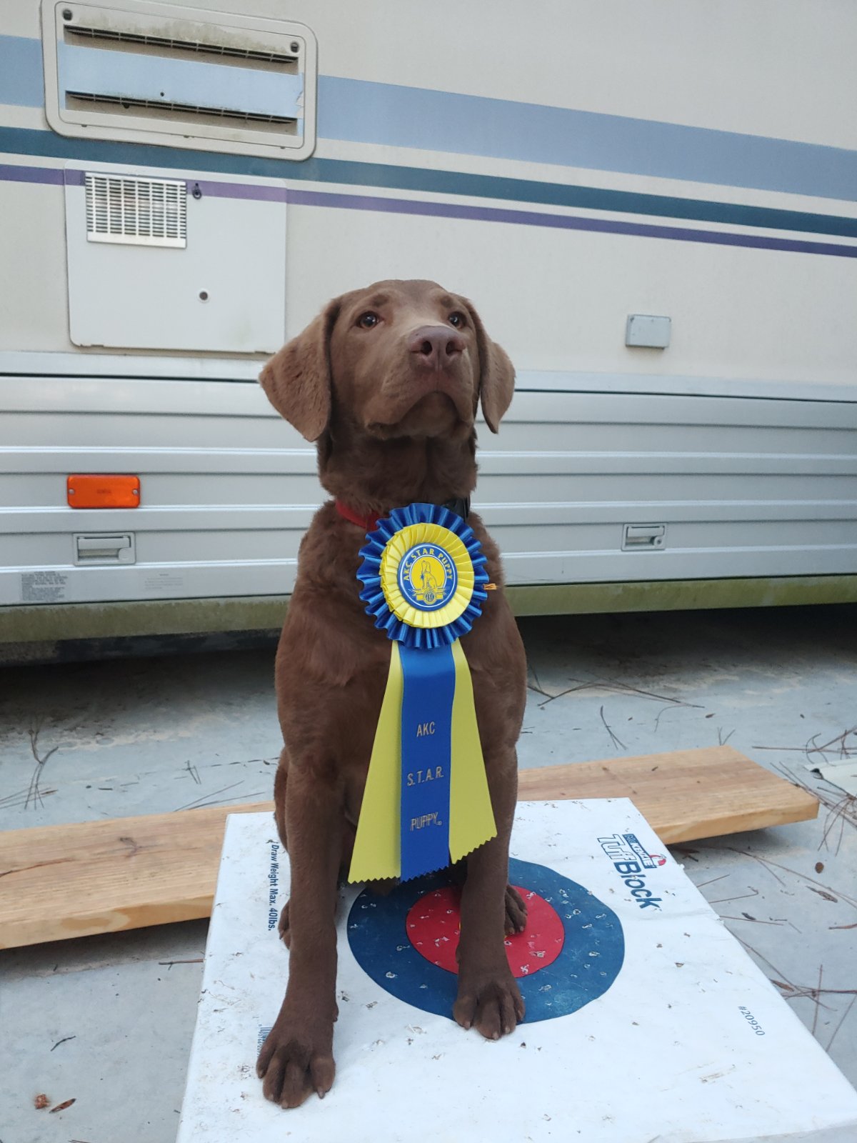 Reginald "The Knife" O'Shea Ledenfer, call name Buck. I have been training Buck and if I can keep my wind will continue doing so. Buck came from Kentucky. Breed by Sky Pond Chesapeake's. He has a wonderful bloodline and was able to garner three points towards his Championship at his first dog show. He won best of opposite sex two days in a row and is now 9 months old. His speed in water retrieves in nothing short of remarkable and stays focused as if their is nothing else in the world but his retrieve. Buck also has his CGC and Novice Trick titles.